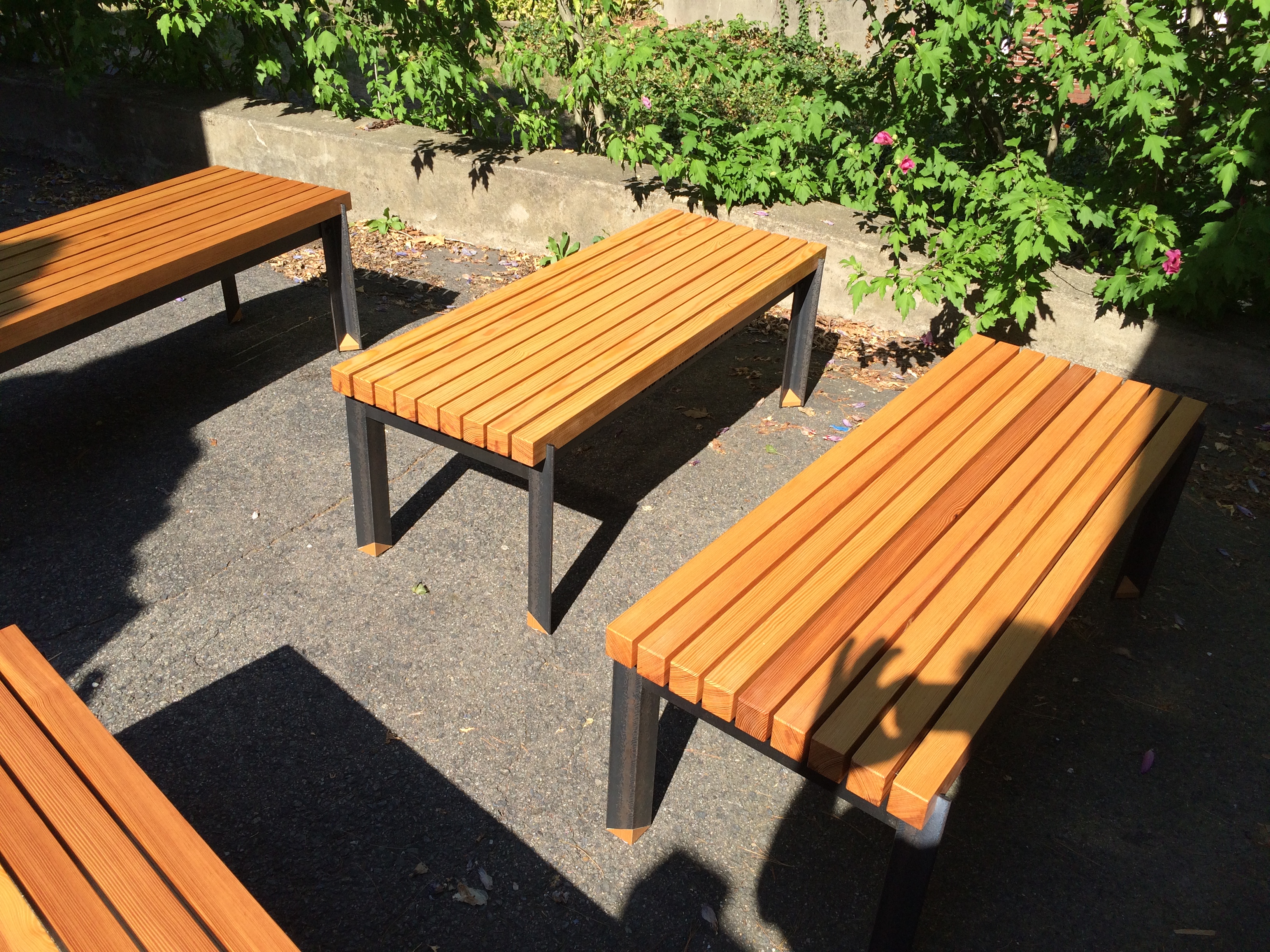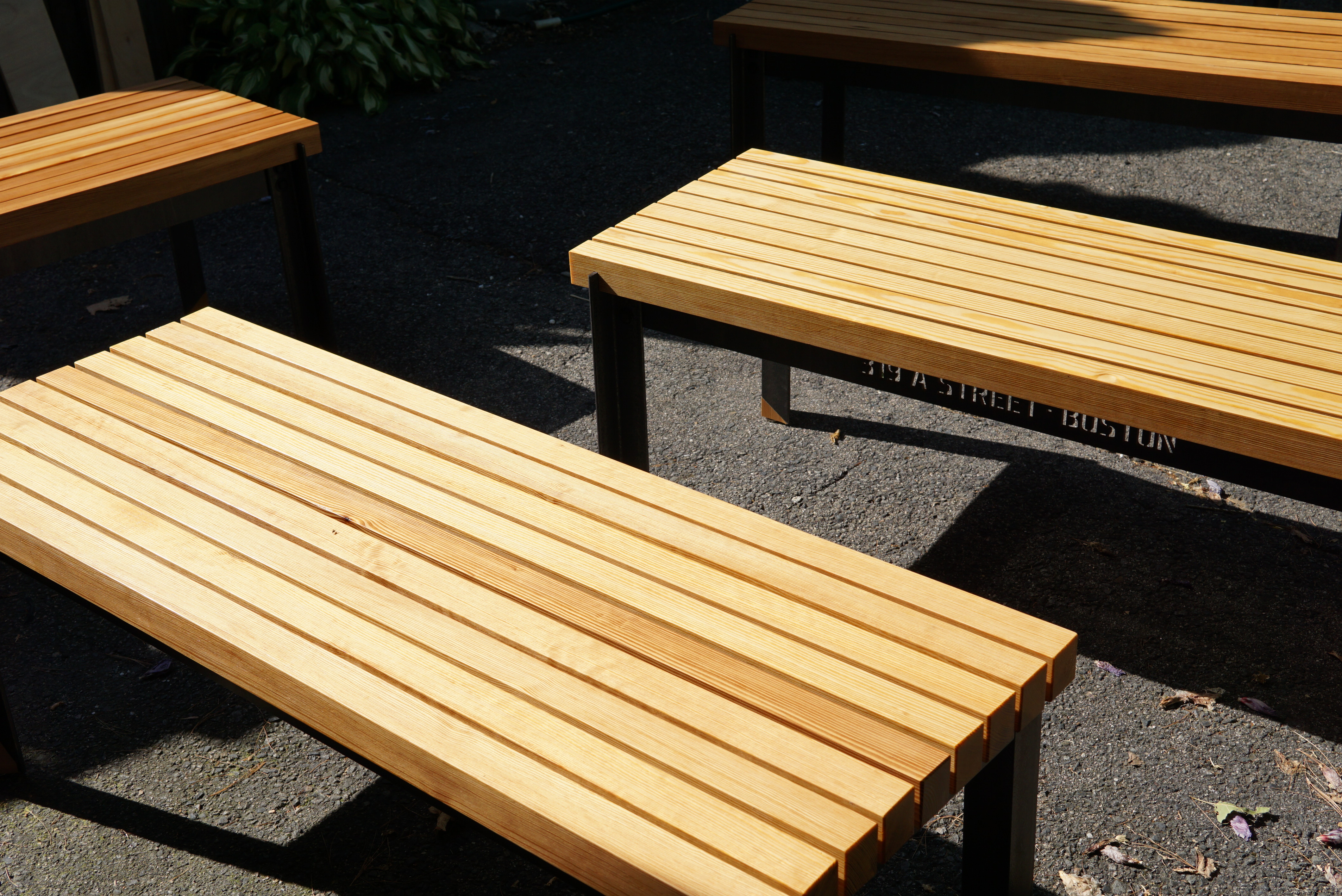 319 A Street, in Boston, is a redevelopment of a 19th century warehouse building. Existing 12x18 old growth Eastern Pine beams, were removed for a new elevator shaft. These are milled to mimic the beam proportions for 5 benches positioned in each floor's elevator lobby. 3-d printed "feet" cap blackened steel legs – a nod to contemporary materials.